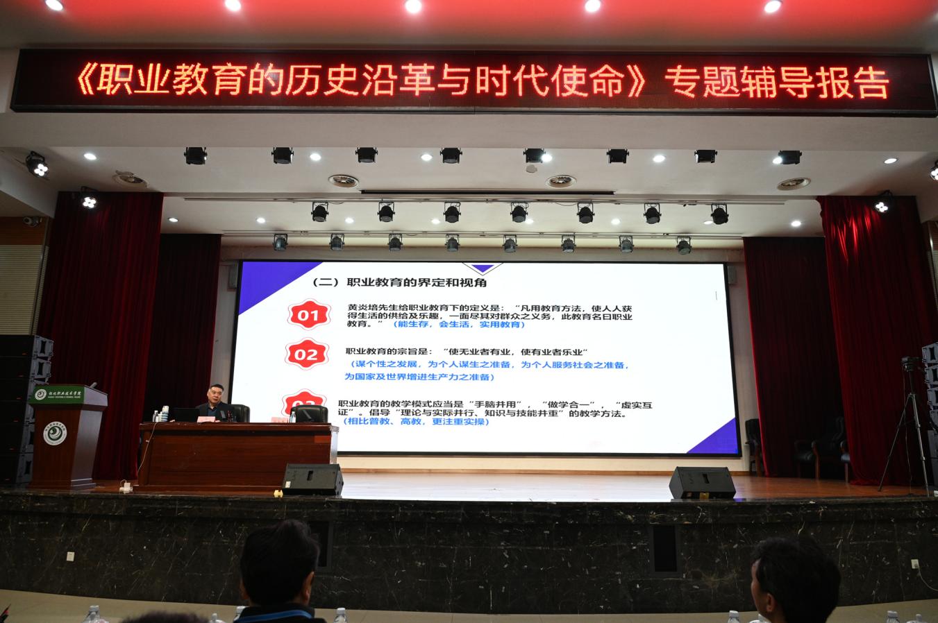 近日,学校全面从严治党工作会议暨第四届二次教职工代表大会在学校大会议室召开。教育部职业教育与成人教育司原二级巡视员刘杰受邀作《职业教育的历史沿革与时代使命》辅导报告。党委书记胡扬帆主持会议,党委副书记、校长刘学文,校领导张云龙、罗向东、廖冬云、罗文忠、周碧波、向敏、肖宪龙、钟峰、李亚玲、刘鑫参加,全校四百余名教职工参加会议。