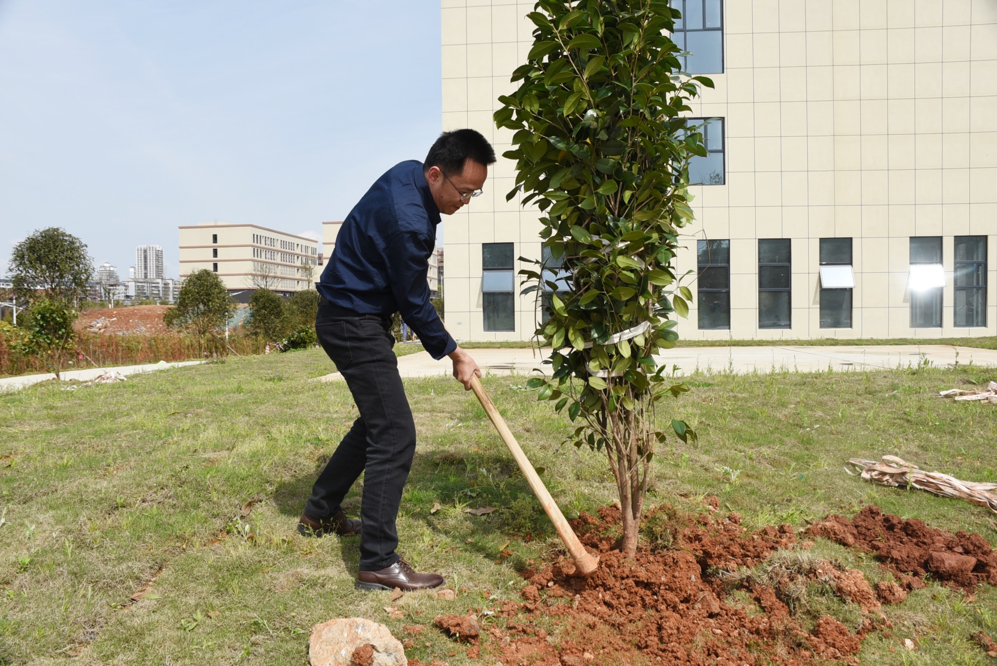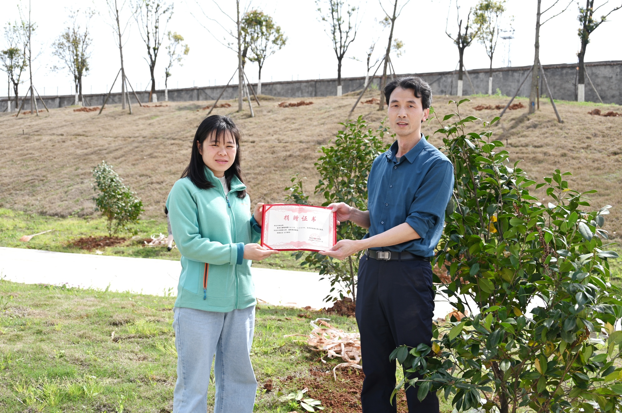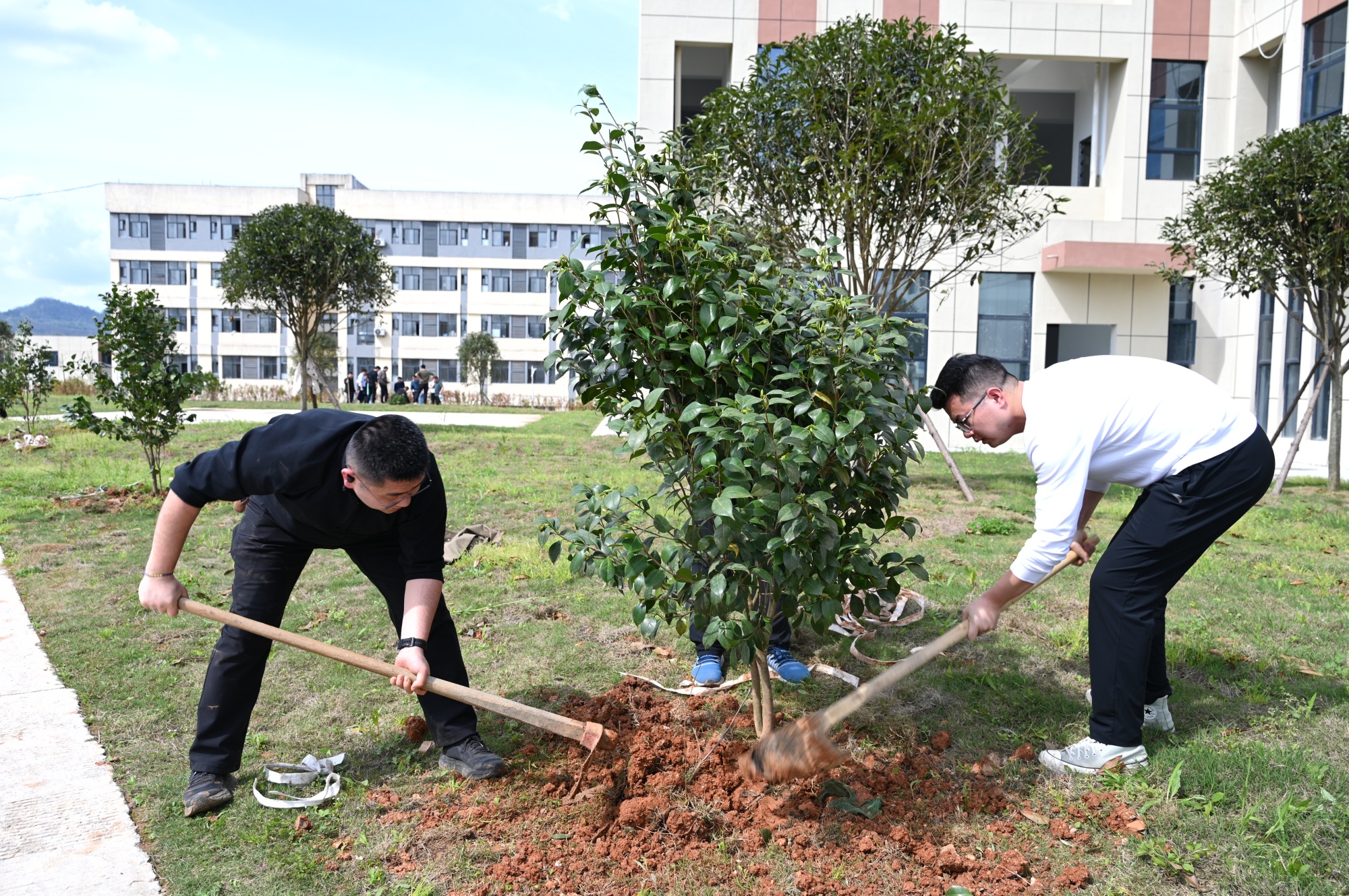 此次义务植树活动在学校新食堂至新建的3号楼周围集中栽植山茶花和紫薇近200株。
