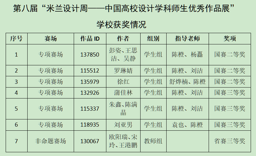 近日,由中国教育国际交流协会、中国高等教育学会联合主办的,第八届“米兰设计周——中国高校设计学科师生优秀作品展”国赛获奖结果揭晓。我校信息与设计学院师生共获专项赛场学生组国赛二等奖三项、三等奖三项;非命题赛场教师组湖南省赛区三等奖一项。
