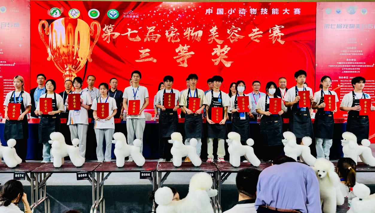 在中国小动物技能大赛第七届宠物美容专赛中,三名参赛学生均荣获三等奖。他们分别是李艺强(指导老师:陈杨超、甘泉)、杨鸿(指导老师:杨甜、陈杨超)、周楠(指导老师:甘泉、杨甜)。