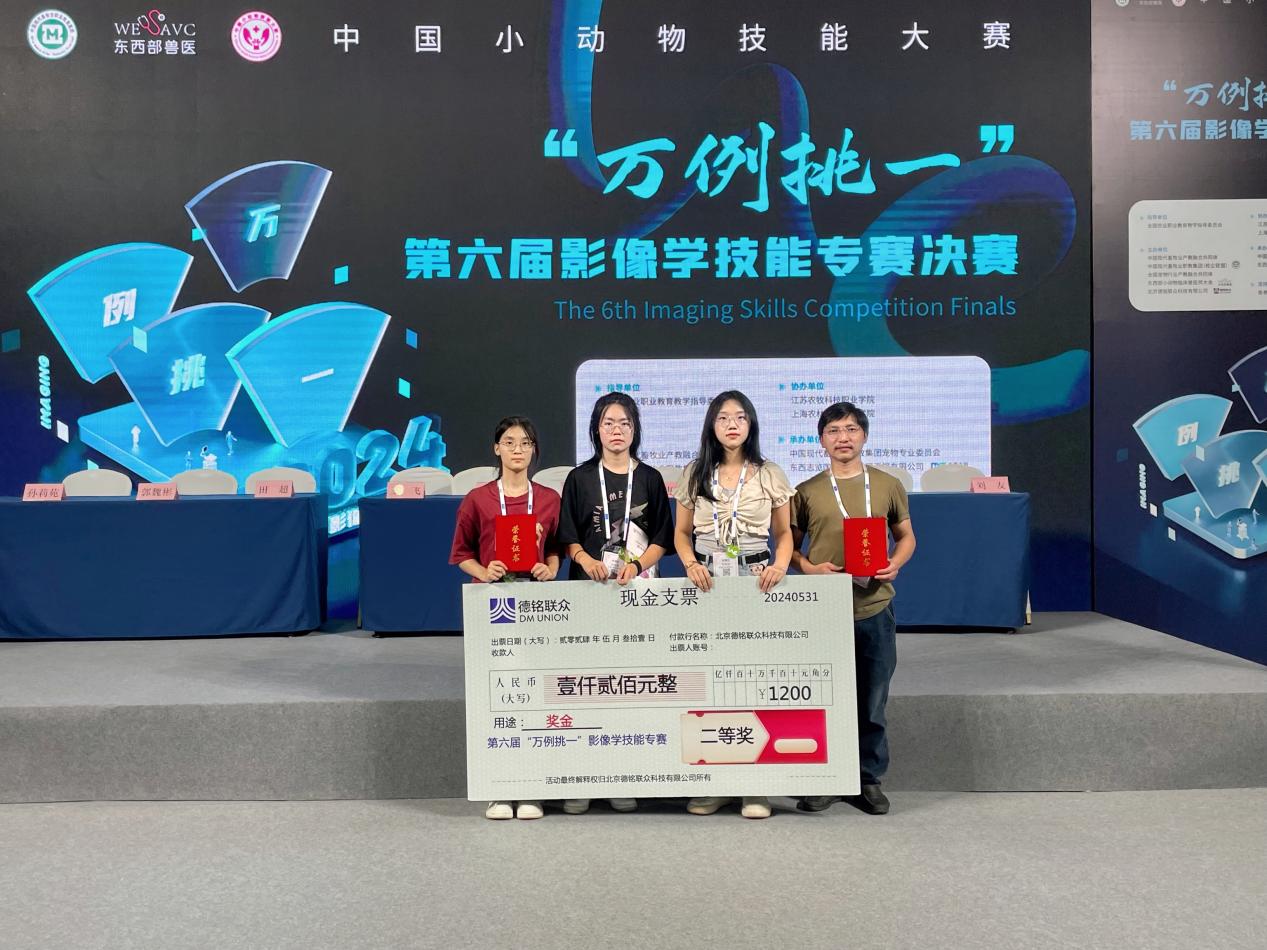 在中国小动物技能大赛“万例挑一”第六届影像学技能专赛上,由罗世民、白玲老师指导的学生谢媛媛、邓依雅、徐玲玲,荣获二等奖。