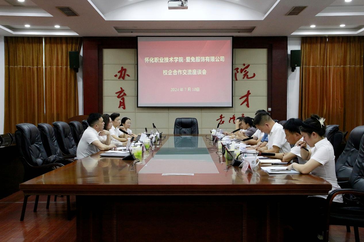 会上,爱兔服饰有限公司相关负责人介绍了公司情况,与会人员就校企合作方案进行了探讨。