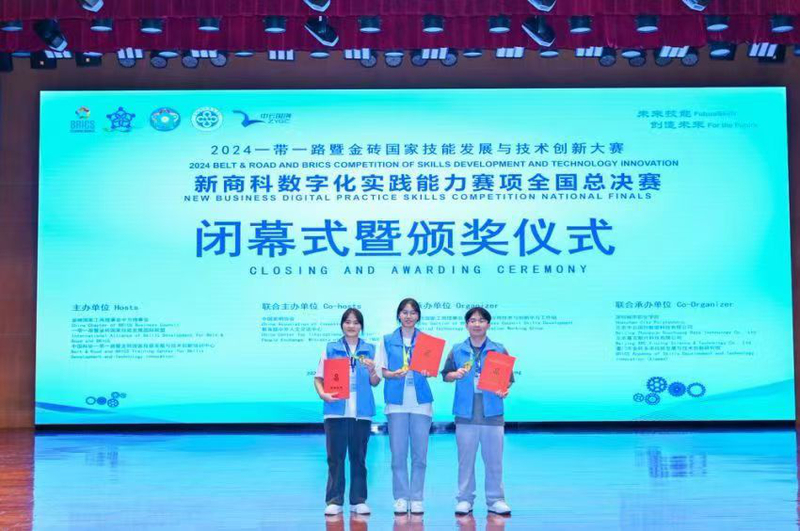 近日,2024“一带一路”暨金砖国家技能发展与技术创新大赛新商科数字化实践能力赛项全国总决赛在深圳城市职业学院圆满结束。我校商贸旅游学院智能物流技术专业学生孙松俊、黄丹丹、肖圆媛荣获2024年“一带一路”暨金砖国家技能发展与技术创新大赛新商科数字化实践能力赛项高职组一等奖,谢红英、曾囿儒荣获“优秀指导老师”,学校荣获“最佳组织奖”。