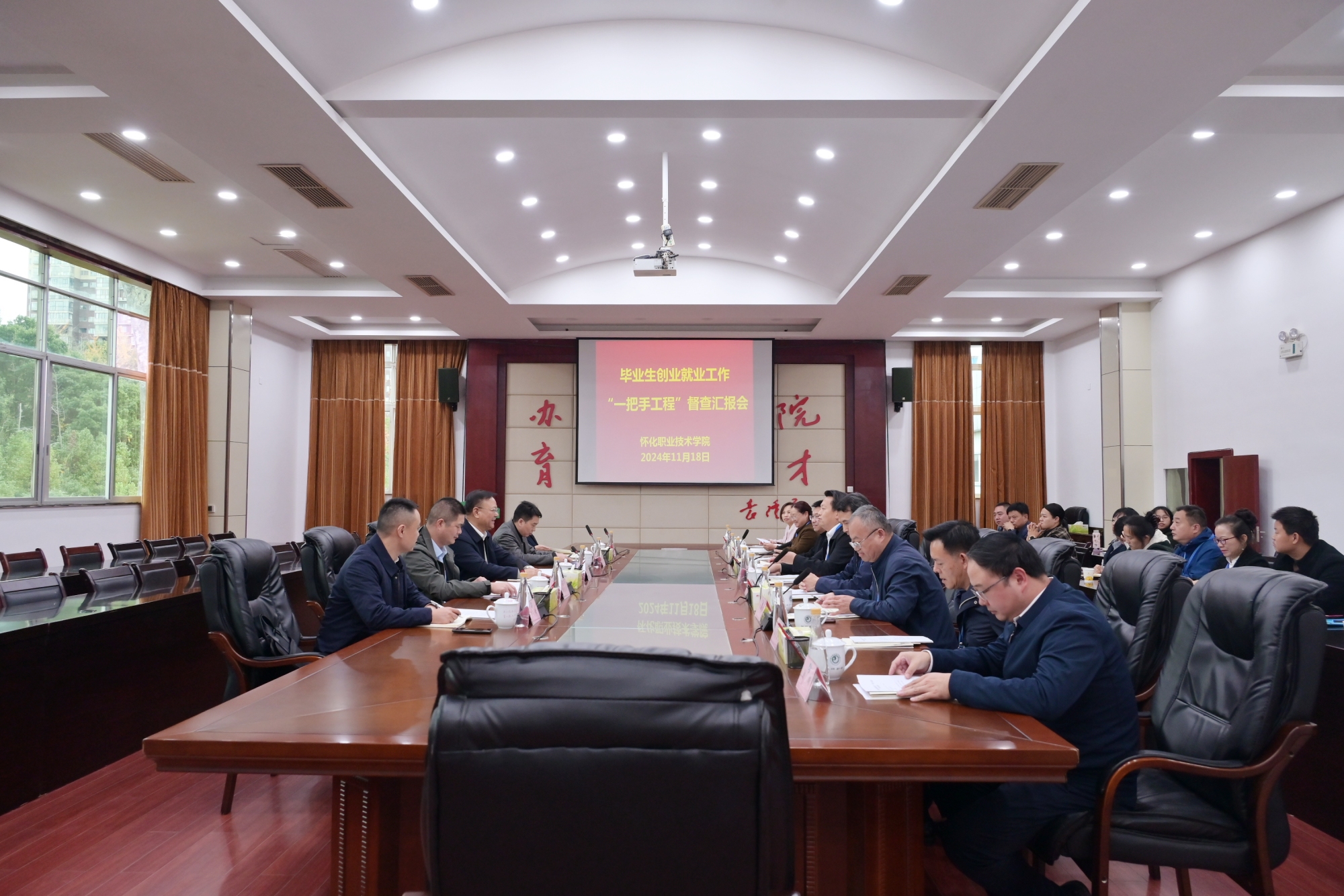 11月18日,湖南省普通高校毕业生就业创业工作“一把手工程”督查组一行5人在督查组组长、湖南化工职业技术学院党委书记陈超的带领下,现场督查学校毕业生就业创业工作“一把手工程”落实情况。学校全体校领导出席座谈会,学校职能部门、二级学院相关负责人参加座谈会。督查汇报会由学校党委书记胡扬帆主持。