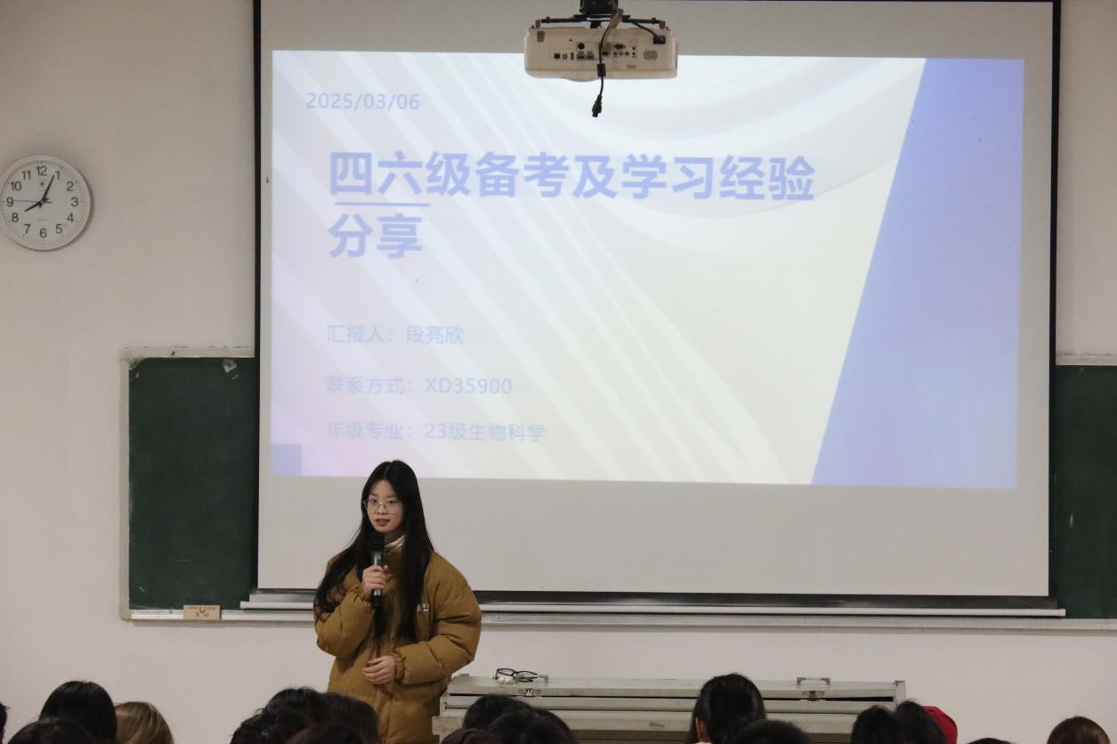 近日,动物科技学院在教学楼T4教室开展英语四六级备考经验交流会,学院200余名学生参加。本次经验交流会由2023级生物科学1班学生段亮欣主讲。