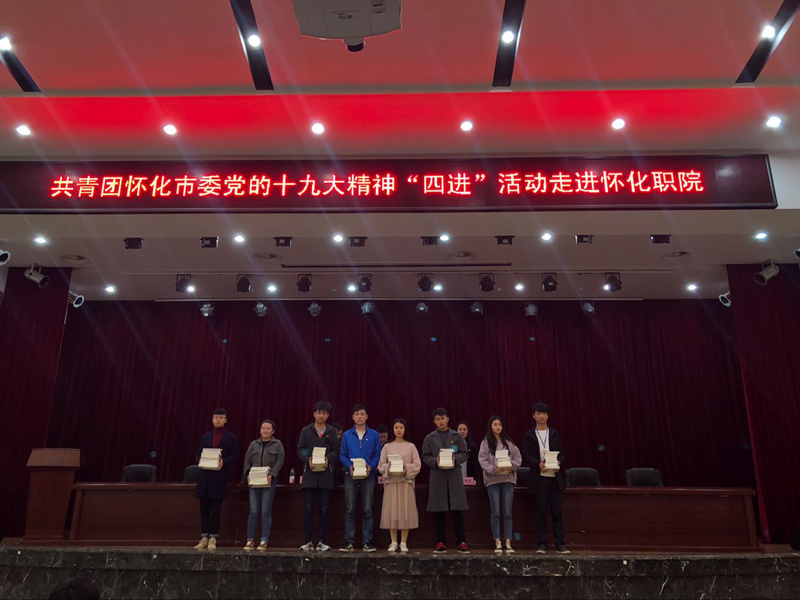 本次团市委党的十九大精神“四进”校园活动共有四项内容:一是送书籍活动,团市委将《党的十九大文件汇编》《党的十九大报告学习辅导百问》《习近平关于青少年和共青团工作论述摘编》三本书作为团课辅导资料赠予各团支部;二是送团课活动,团市委收集整理了党的十九大精神宣讲资料,制作成宣传讲义和PPT用于各团支部开展党的十九大精神主题团日活动学习使用;三是评选优秀心得活动,广泛组织发动团员青年积极参与撰写学习十九大精神心得体会,对优秀心得给予现金和电影票奖励;四是手机有奖竞答活动,鼓励大家积极主动学习。