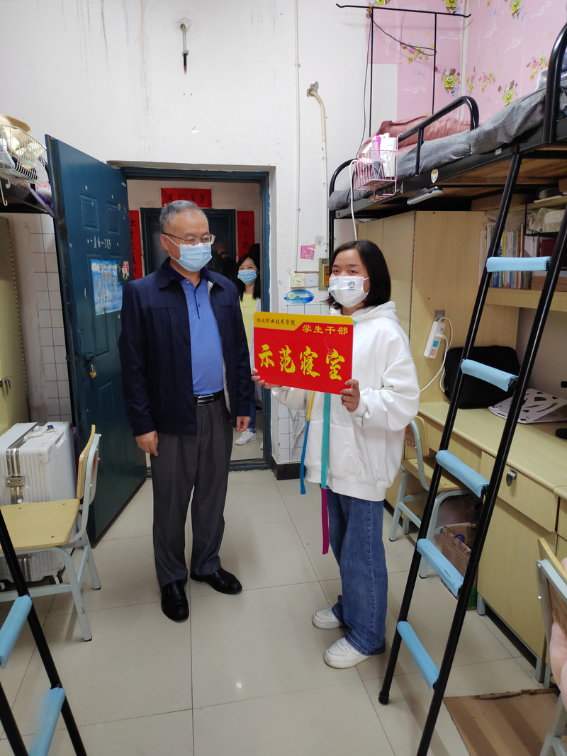 罗向东深入学生宿舍为学生干部、学生党员、入党积极分子示范寝室挂牌,并与学生干部亲切交谈。他强调,在疫情频发的高峰期,更应保持良好的生活环境。另外,他还对示范寝室提出更高要求,要加强廉洁意识的培养,自觉抵御不正之风,养成良好的行为品格,从而培养‘大国工匠’的职业精神。希望示范寝室能继续坚持,一人带动全宿舍,共同打造温暖舒适的寝室坏境,塑造清正廉洁的寝室文化。