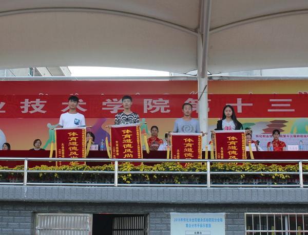 总裁判长宣布成绩,本届运动会,商贸管理系、建筑工程系、环境与生物科技系分别获甲组团体总分第一名、第二名、第三名。商贸管理系、信息与艺术设计系、建筑工程系分别获得乙组团体总分第一名、第二名、第三名。环境与生物科技系、动物科技系、电子电气工程系、人文科技系等四个系获道德风尚奖。
