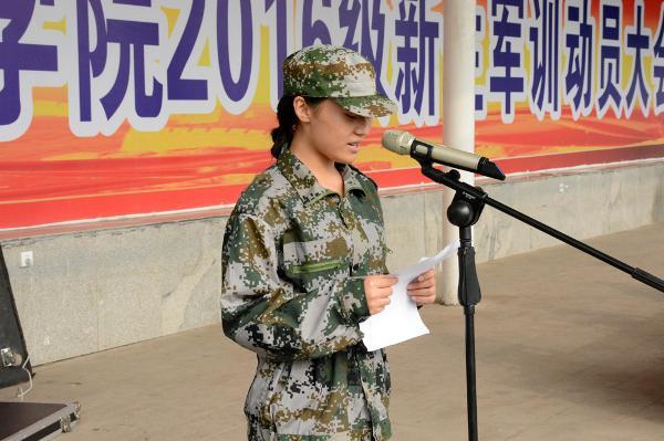 在动员大会上,商贸管理系的田家宁同学有幸能够代表新生发言。“军训,我们将经历平日难以经历的艰辛,我们将获取教室里无法获取的知识,我们将充分品尝火热军营之于我们的甜酸苦辣;在这一课中,我们所经受的,我们所积淀的,不仅仅是身体的考验,意志的锤炼、品格的培养,更是心灵的净化、情感的熏陶、精神与人格的升华。”