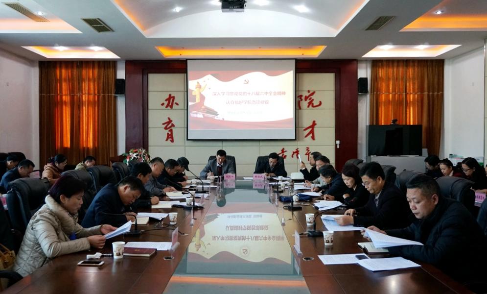11月11日下午,我院召开党委中心组学习(扩大)会议,专题学习党的十八届六中全会精神,并就我院如何贯彻落实全会精神做出了部署和强调。会议由党委书记胡佳武主持,院长王聪田、副书记邬国盛等院领导出席会议,全院各处室部门负责人、系部主任及书记参加了学习。