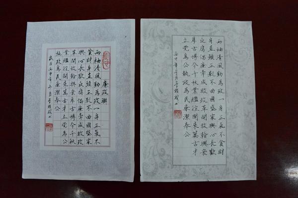 为积极宣扬廉政文化,培养和提高广大师生员工的书法学习热潮和廉政自律意识,丰富广大师生员工的业余文化生活,院团委、院纪委在第十一届隆平校园文化艺术节期间举办怀化职业技术学院软笔、硬笔廉政书法比赛。孙海鸥老师和张雪松老师应邀担任此次大赛的评委老师,本次比赛共收到作品近200件,上交的作品字体不一,各具特色,形神兼备。经过评委老师现场评比,选出软笔廉政书法比赛一等奖一名、二等奖两名、三等奖三名,硬笔廉政书法比赛书法一等奖一名、二等奖两名、三等奖三名、优胜奖三名。
