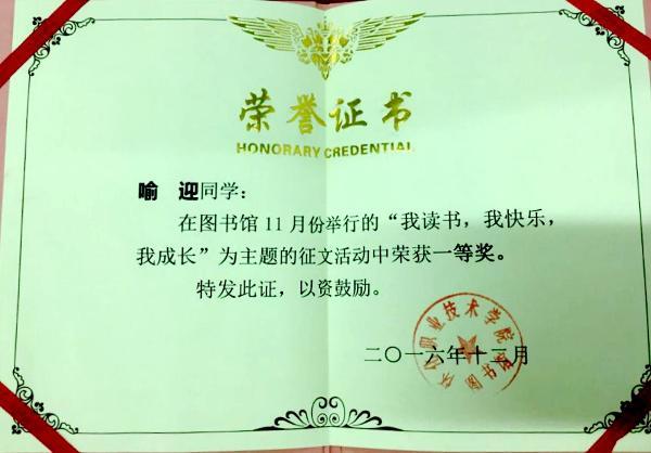 为倡导全民阅读,建设书香校园,我院图书馆11月份举办的“我读书,我快乐,我成长”征文活动日前落下帷幕,本次活动共收到112篇学生作品。经评委会审议,最终评选出作品一等奖2名,二等奖6名,三等奖11名。其中,15计应高职2班喻迎《读<草房子>有感》和16环生园艺高职班谢买琼《时光轻浅 许你安然》以优美的文辞和深刻的思想赢得评委们的一致赞扬,荣获一等奖。