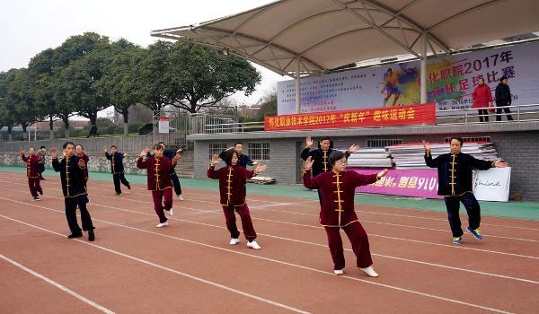 上午9点,学院太极协会的42式太极表演首先奏响了趣味运动会的序曲,11位会员以柔克刚的拳法和行云流水的步伐赢得了在场教职工的阵阵掌声,随后广场舞协会表演了欢乐喜庆的舞蹈《舞动中国》,体育与舞蹈协会成员动作整齐划一地表演了《第九套广播体操》。