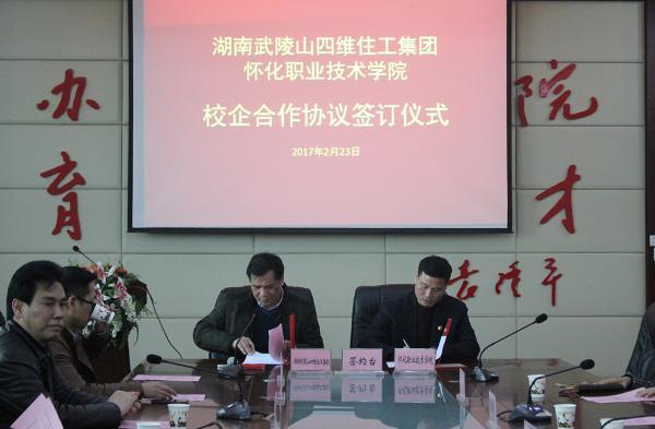 湖南武陵山四维住工集团与我院在员工培训、学生就业与顶岗实习、实训基地建设、合作办学等方面达成了共识。我院将成为集团的人力资源培训基地,为集团提供相关专业培训。集团将成为我院的校外实训基地,由我院为集团输送优秀人才到岗就业,以及选派优秀学生到集团进行顶岗实习,并由集团合理给予学生实习报酬。集团将在我院开设订单班,本着学生自愿原则为集团定向培养、输送人才,并由集团在订单班设立每年不低于两万元的“四维”奖学金,以及承担学生就业安置。不仅如此,双方还会互派挂职交流合作,我院将每年定期派出专业骨干教师到集团以及下属相关企业挂职锻炼,培养双师型队伍,提高我院教师专业素质。