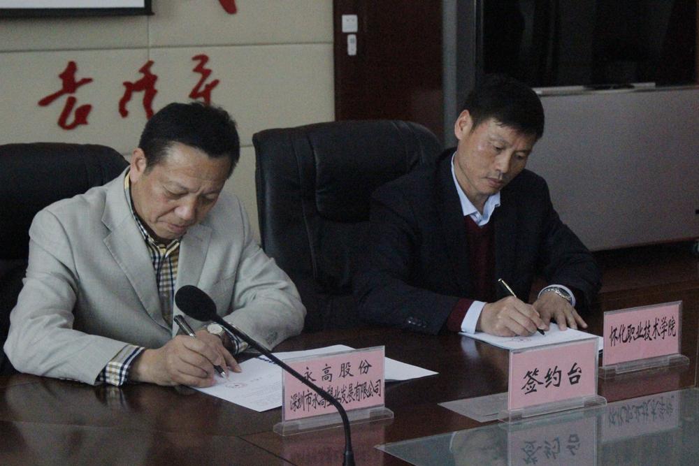 深圳市永高塑业发展有限公司副总经理柳国安、我院党委书记胡佳武、院长王聪田、党委副书记邬国盛、副院长张圣喜出席签约仪式,相关处室、系部负责人以及教师、学生代表参加仪式,仪式由院长助理匡晓东主持。