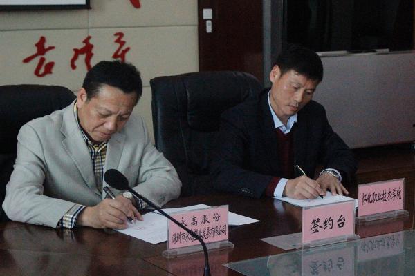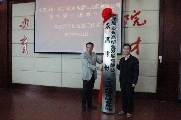 王聪田院长代表我院与永高股份深圳市永高塑业发展有限公司签订合作协议;胡佳武书记与柳国安副经理共同揭牌,永高股份深圳市永高塑业发展有限公司人才培养项目研发基地正式在我院建立。