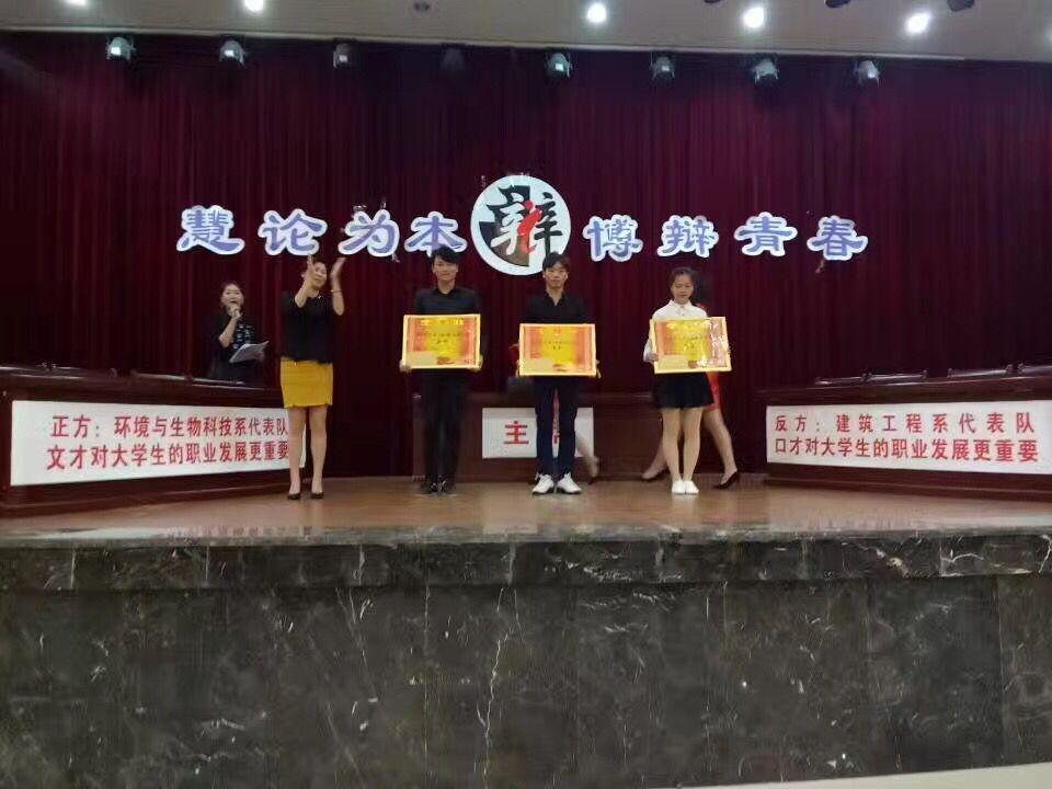 最终,环境与生物科技系代表队荣获冠军,建筑工程系代表队获得了亚军,动物科技系代表队获得了季军。陈旭斌、严鑫、向东、夏浩四名同学荣获最佳辩手荣誉称号。院长助理廖冬云给获奖的代表队和个人颁发了奖状和荣誉证书,本届辩论赛圆满落下帷幕。